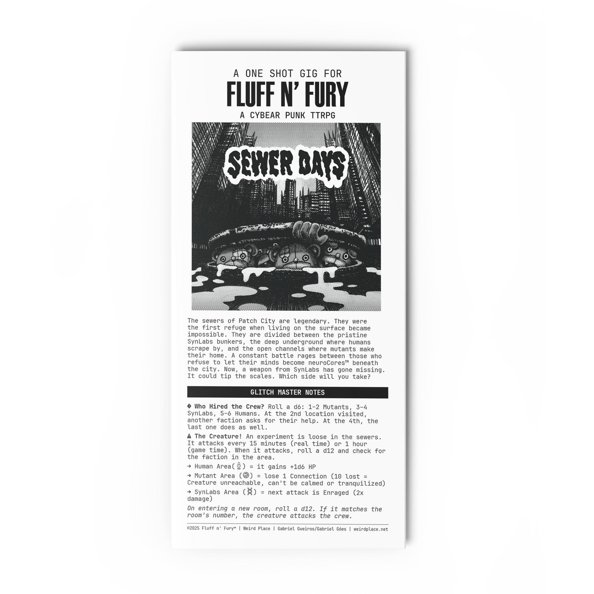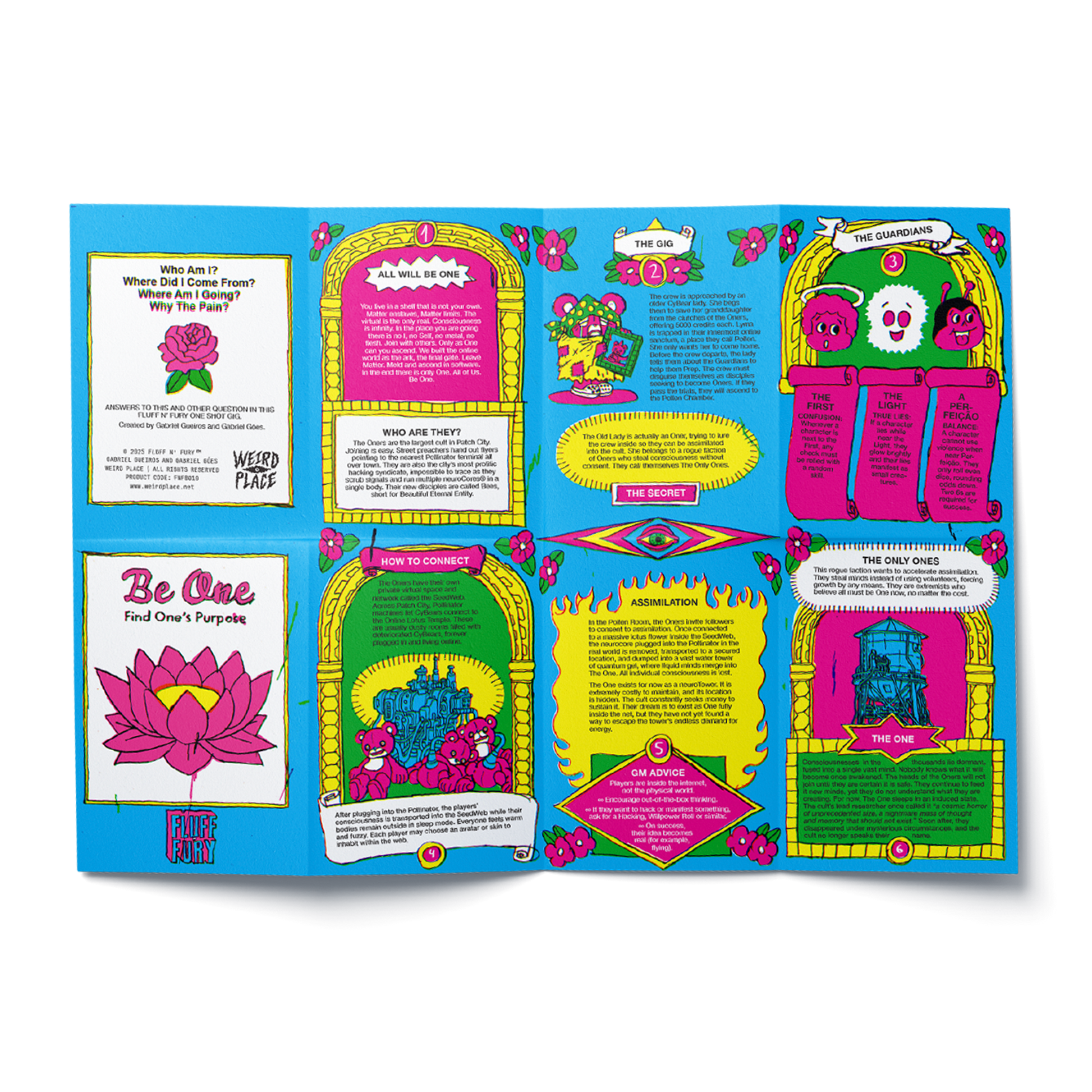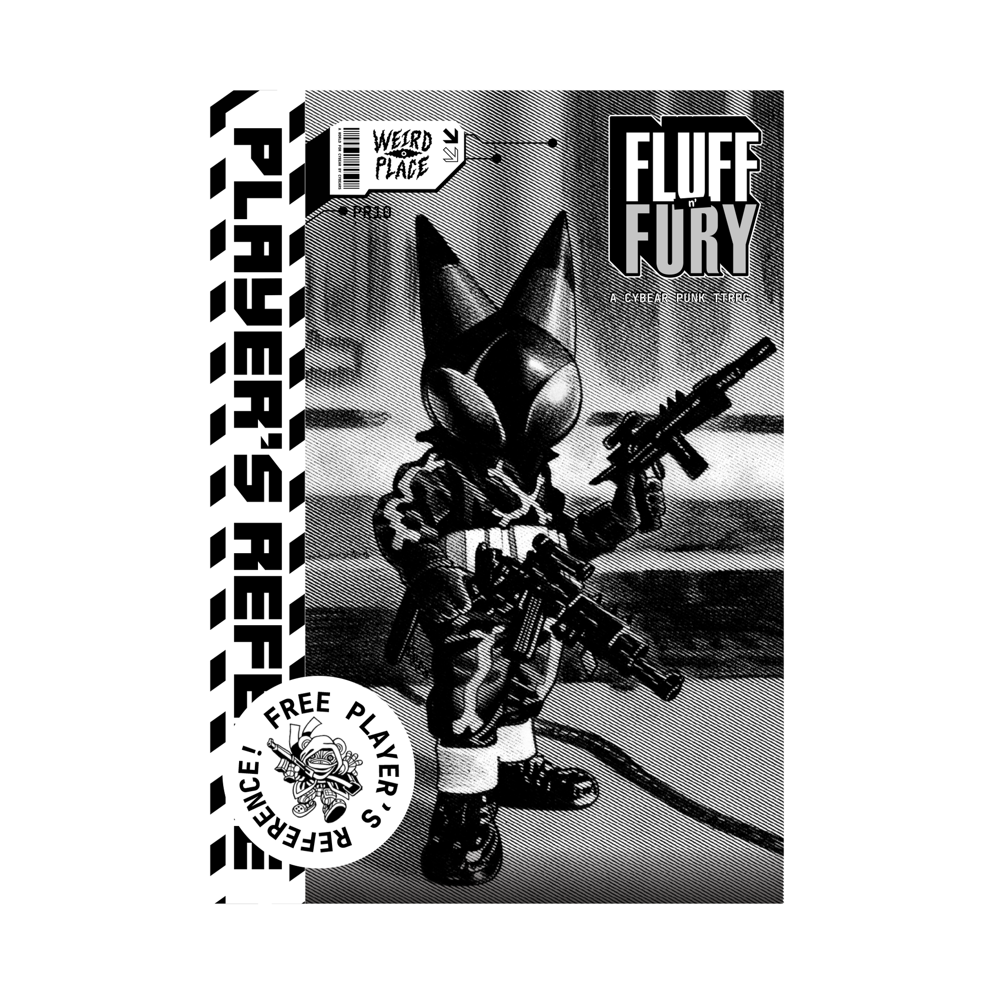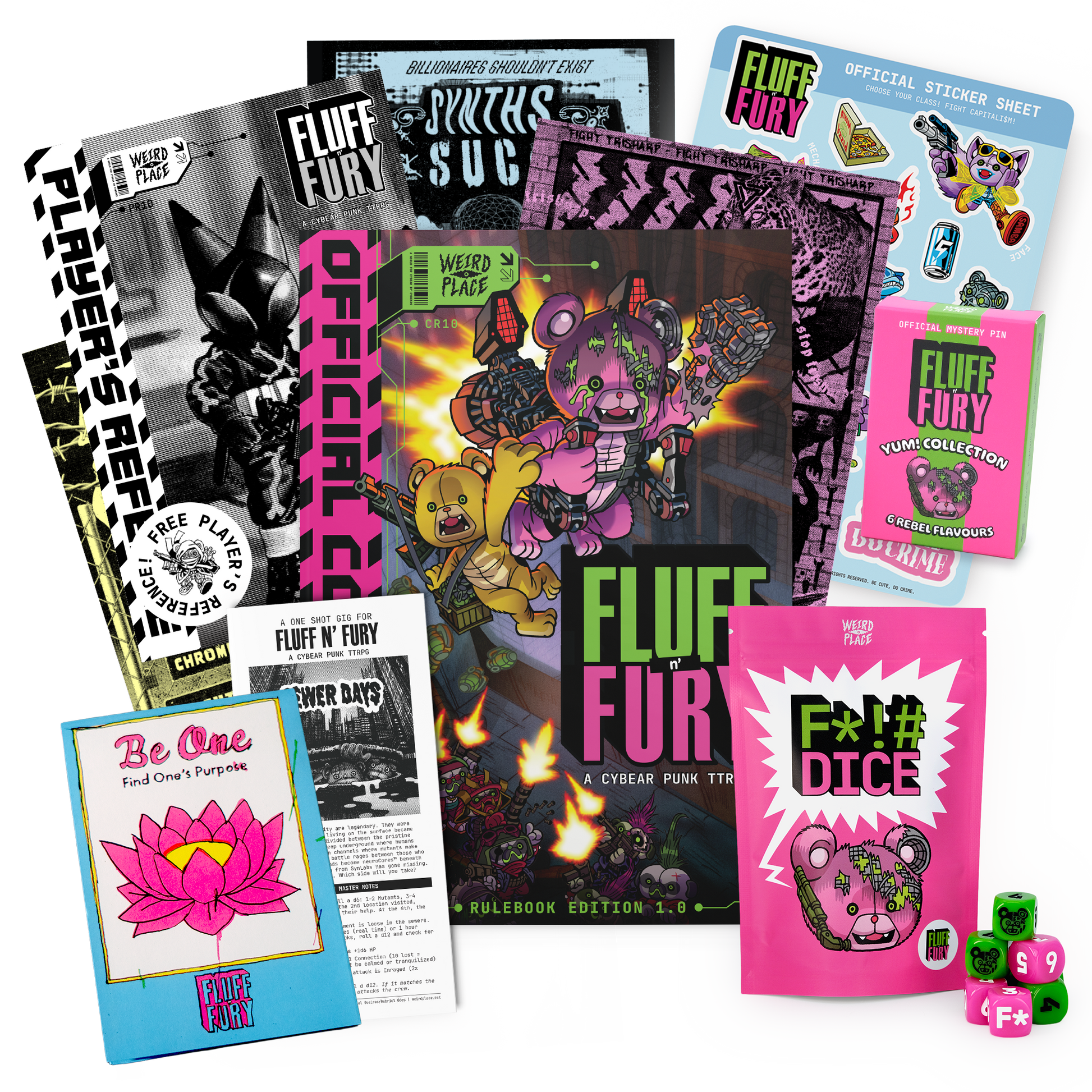Core Rules book (+ digital edition), 2 extra physical adventures, the F*!# Dice, Official Sticker sheet, Official Mystery Pin, and a free Player's Reference Zine + promotional posters (while supplies last)